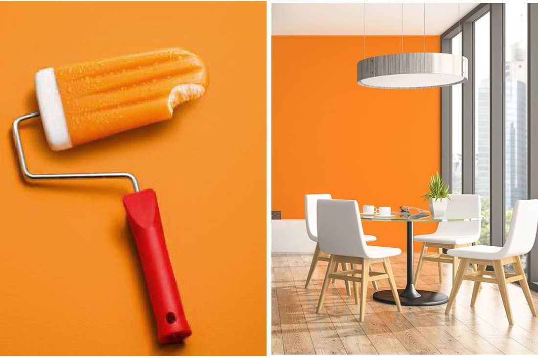 Сочетаемость цвета стен: насыщенный оранжевый оттенок стены будет хорошо сочетаться с зеленым напольным покрытием или ковром. К этой композиции можете подобрать элементы желто-зеленого, белого или кремового оттенков.