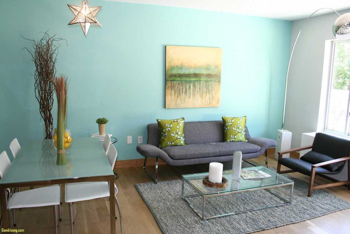 Сочетаемость цвета стен: если вы спите в светлой комнате с большим окном, для окрашивания одной стены (например, в изголовье кровати) выберите насыщенный голубой цвет, который хорошо сочетается с оттенками синего и серого цветов остальных стен и пола.