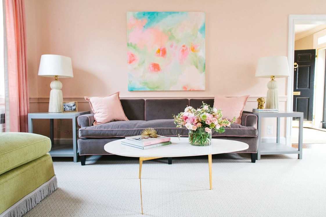 Теплый, мягкий тон оштукатуренных стен – молочный, топленое молоко, нежно-розовый обязательно станет отличной отправной точкой при оформлении гостиной.