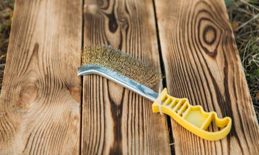 - металлические щетки с разной жесткостью, которыми удаляют мягкие волокна с поверхности древесины;