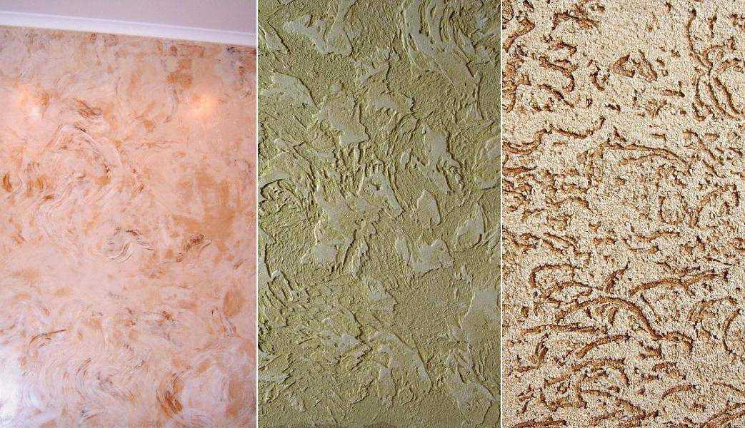 Так выглядят покрытия, сделанные венецианской, фактурной и структурной штукатурками соответственно
