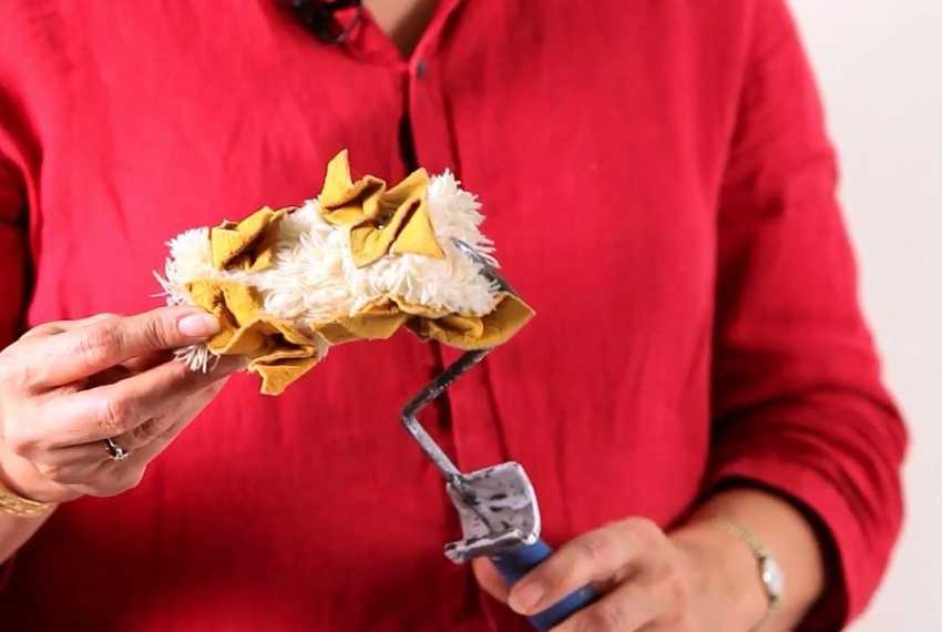 Для получения рельефа на ролике подойдет бельевая веревка, которой обматывают цилиндрическую часть. Витки могут располагаться параллельно друг другу или перекрещиваться. Можно намотать веревку на инструмент в хаотичном порядке.