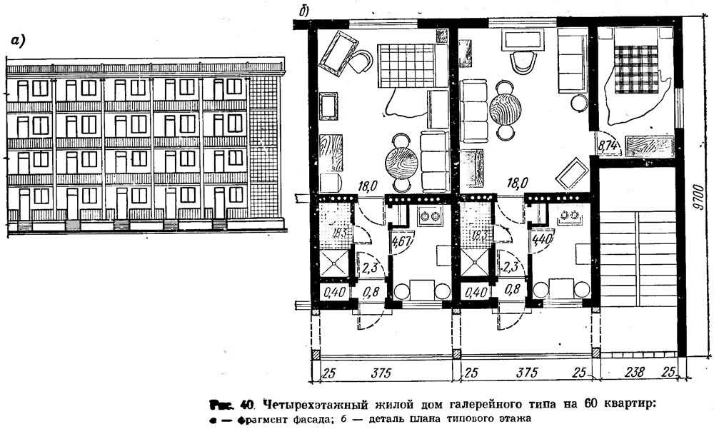 Рис. 40. Четырехэтажный жилой дом галерейного типа на 60 квартир В южных районах для защиты квартир от перегрева целесообразно строить дома галерейного типа (рис. 40). В этих домах квартиры размещают по одну сторону открытой галереи, ширина которой должна быть не менее 1,2 м. Окна квартир в галерейных домах обращают на две стороны для обеспечения сквозного проветривания, что в условиях юга является обязательным, и градостроительной маневренности зданий. Кроме того, открытые галереи создают большую связь квартиры с природой и защищают их от перегрева. В каждой квартире между жилыми комнатами и галереей располагают кухню, санузел, переднюю. Таким приемом жилые помещения изолируются от шумной части дома — галереи.