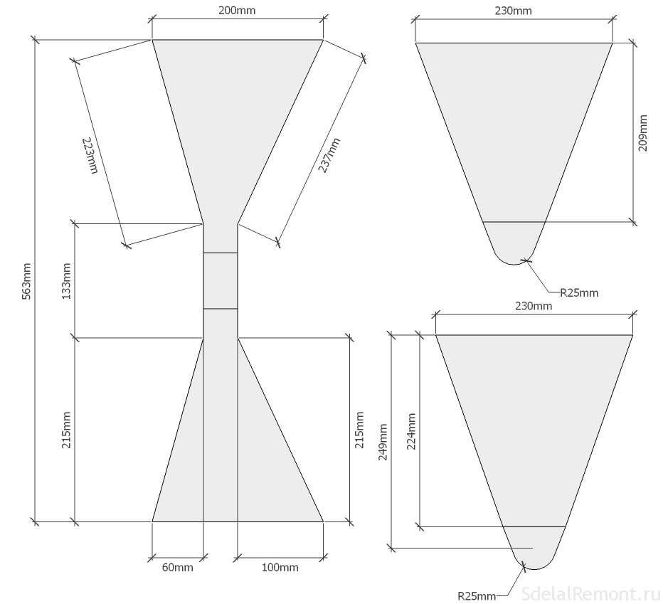 - На бумаге нарисовать контур ковша с указанием его всех его размеров, и по нему составить чертеж.