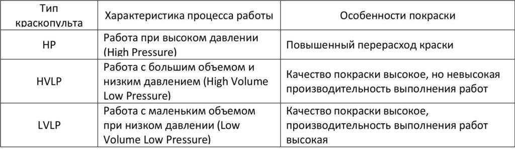 При подаче воздуха под давлением в сопло из емкости поступает краска, при этом она разбивается на мельчайшие капли. Создается облако (смесь воздуха и взвешенных частиц жидкости), через сопло оно направляется на окрашиваемую поверхность. Пневматические краскопульты разделяют в зависимости от используемого давления и формируемого объема потока (табл.).