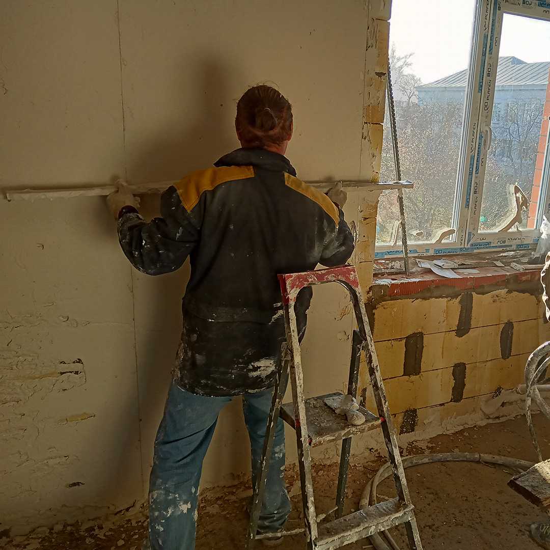 - После заполнения всей поверхности, выравнивают штукатурку коротким правилом.